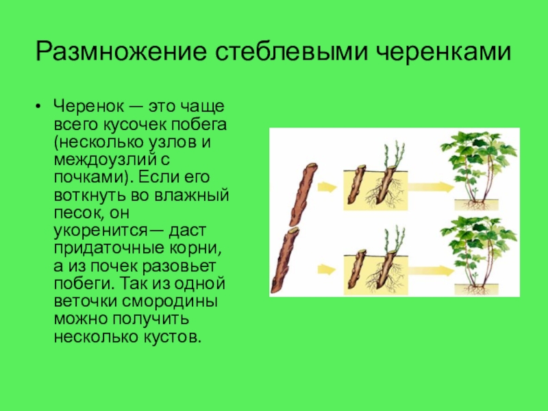 и междоузлий с почками). Если его воткнуть во влажный песок, он укоренится— даст придаточные корни, а из почек разовьет побеги. Так из одной веточки смородины можно получить несколько кустов.