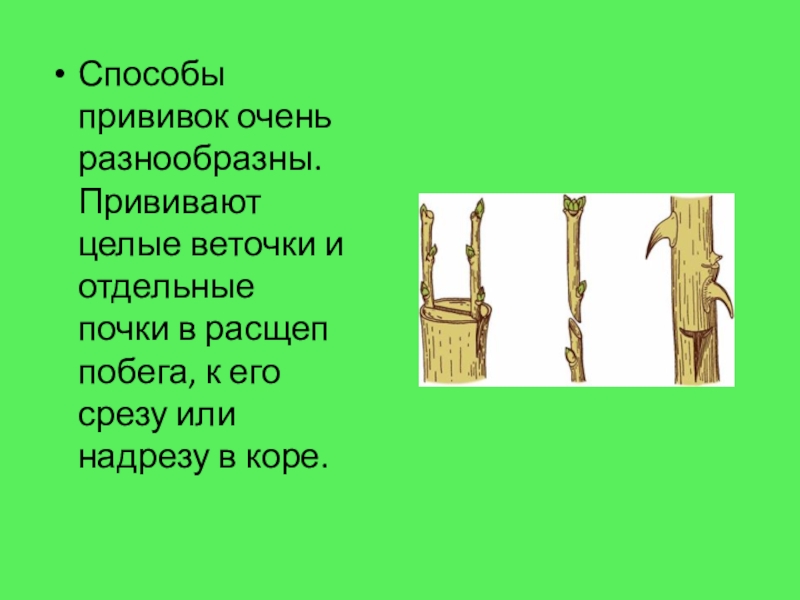 Слайд 22Способы прививок очень разнообразны. Прививают целые веточки и отдельные почки в