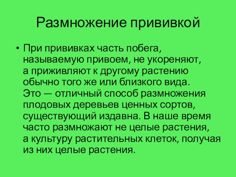 другому растению обычно того же или близкого вида. Это — отличный способ размножения плодовых деревьев ценных сортов, существующий издавна. В наше время часто размножают не целые растения, а культуру растительных клеток, получая из них целые растения.