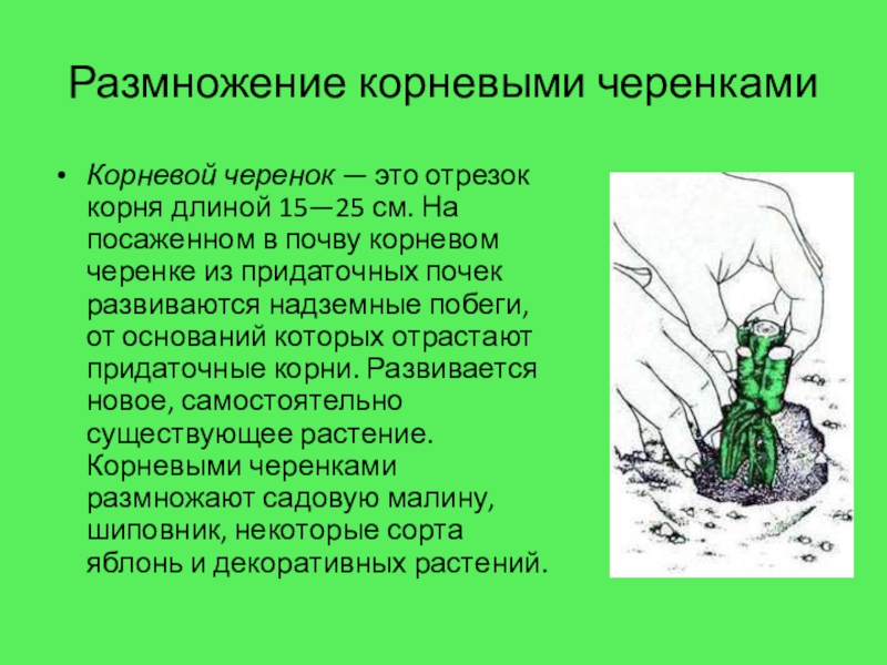 На посаженном в почву корневом черенке из придаточных почек развиваются надземные побеги, от оснований которых отрастают придаточные корни. Развивается новое, самостоятельно существующее растение. Корневыми черенками размножают садовую малину, шиповник, некоторые сорта яблонь и декоративных растений.