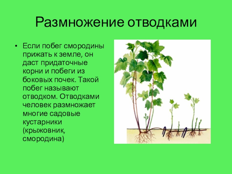 и побеги из боковых почек. Такой побег называют отводком. Отводками человек размножает многие садовые кустарники (крыжовник, смородина)