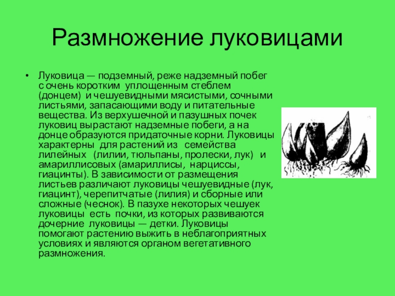 стеблем (донцем) и чешуевидными мясистыми, сочными листьями, запасающими воду и питательные вещества. Из верхушечной и пазушных почек луковиц вырастают надземные побеги, а на донце образуются придаточные корни. Луковицы характерны для растений из семейства лилейных (лилии, тюльпаны, пролески, лук) и амариллисовых (амариллисы, нарциссы, гиацинты). В зависимости от размещения листьев различают луковицы чешуевидные (лук, гиацинт), черепитчатые (лилия) и сборные или сложные (чеснок). В пазухе некоторых чешуек луковицы есть почки, из которых развиваются дочерние луковицы — детки. Луковицы помогают растению выжить в неблагоприятных условиях и являются органом вегетативного размножения.