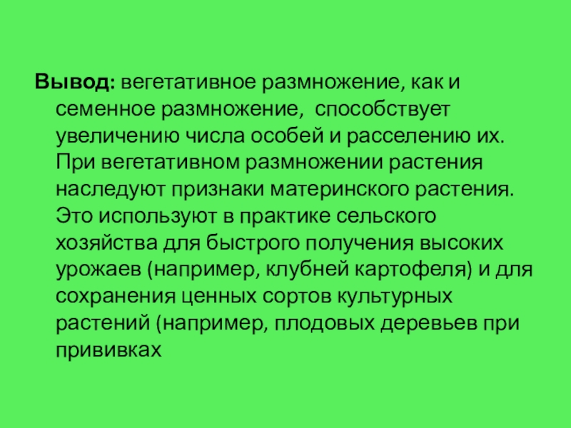 и расселению их. При вегетативном размножении растения наследуют признаки материнского растения. Это используют в практике сельского хозяйства для быстрого получения высоких урожаев (например, клубней картофеля) и для сохранения ценных сортов культурных растений (например, плодовых деревьев при прививках