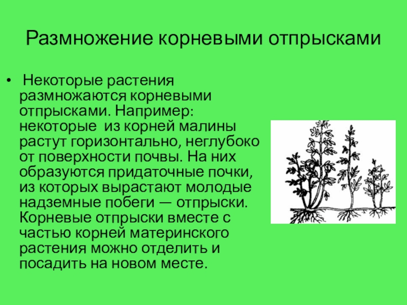 корней малины растут горизонтально, неглубоко от поверхности почвы. На них образуются придаточные почки, из которых вырастают молодые надземные побеги — отпрыски. Корневые отпрыски вместе с частью корней материнского растения можно отделить и посадить на новом месте.