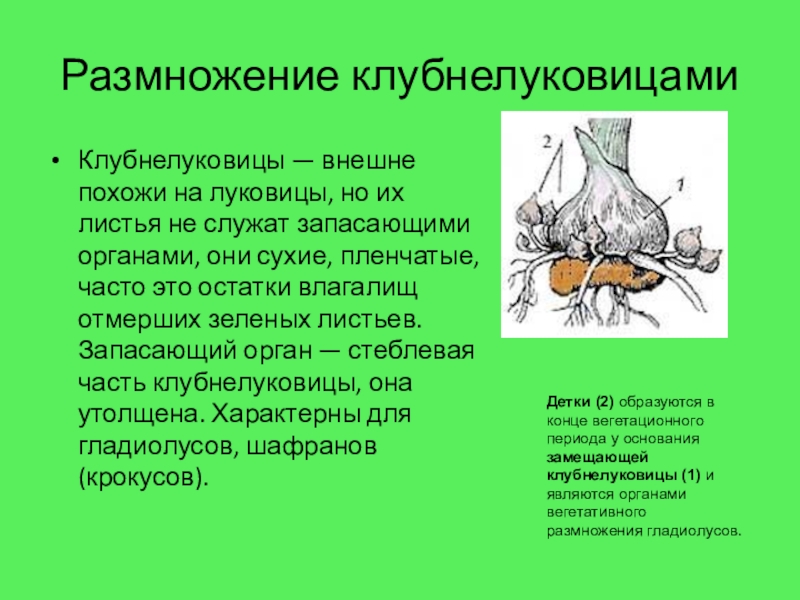 Детки (2) образуются в конце вегетационного периода у основания замещающей клубнелуковицы (1) и являются органами вегетативного размножения гладиолусов.