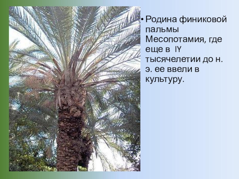 Про финиковую пальму говорят, что голова ее любит солнце, а ноги - прохладу, только финиковые пальмы выдерживают условия пустыни