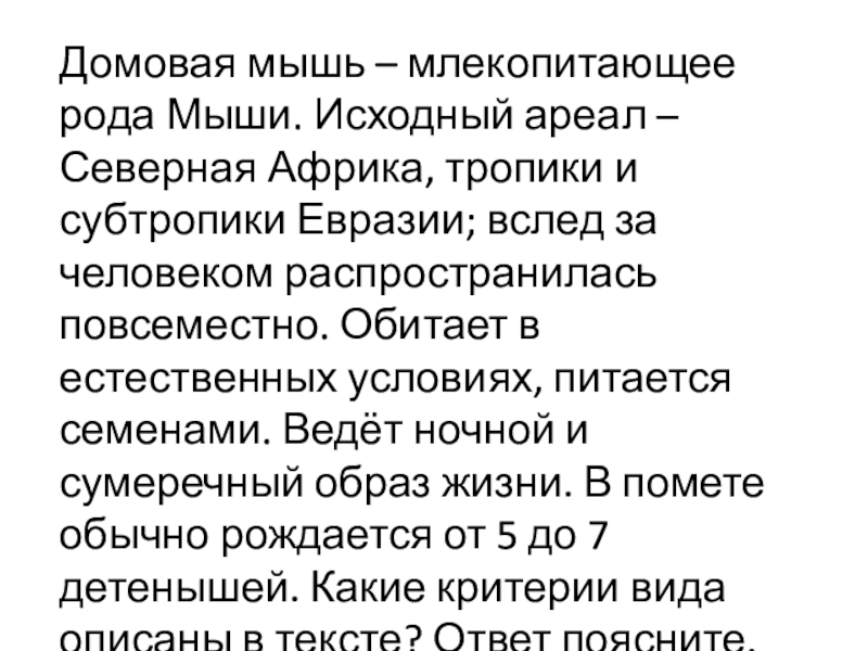 тропики и субтропики Евразии; вслед за человеком распространилась повсеместно. Обитает в естественных условиях, питается семенами. Ведёт ночной и сумеречный образ жизни. В помете обычно рождается от 5 до 7 детенышей. Какие критерии вида описаны в тексте? Ответ поясните.