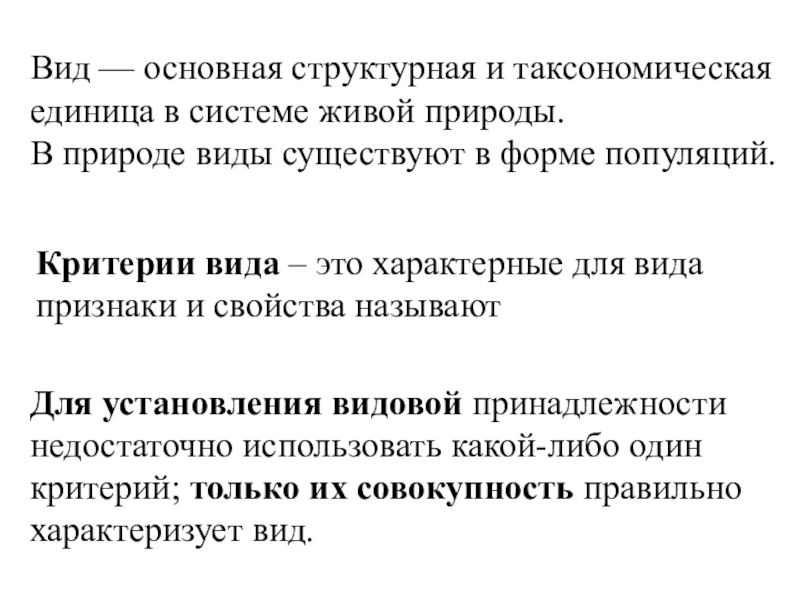 Для установления видовой принадлежности недостаточно использовать какой-либо один критерий; только их совокупность правильно характеризует вид.