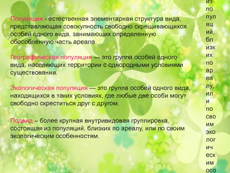 Популяция - естественная элементарная структура вида, представляющая совокупность свободно скрещивающихся особей одного вида, занимающих определенную обособленную часть ареала.