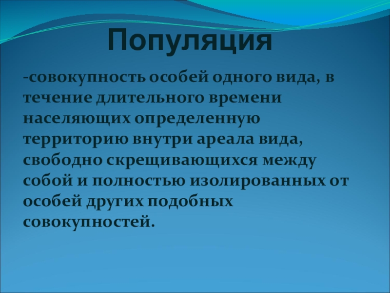 Популяция-совокупность особей одного вида, в течение длительного времени населяющих определенную территорию внутри ареала вида, свободно скрещивающихся между