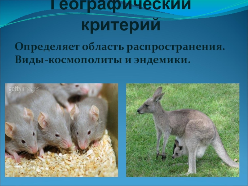 Географический критерийОпределяет область распространения. Виды-космополиты и эндемики.