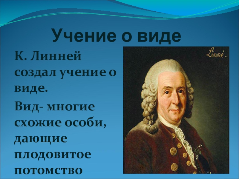 Учение о видеК. Линней создал учение о виде.Вид- многие схожие особи, дающие плодовитое потомство