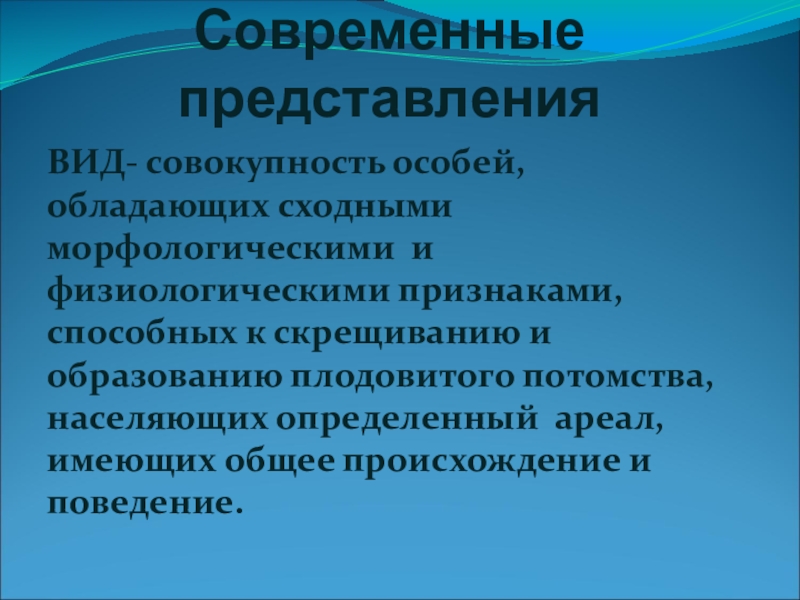 Современные представленияВИД- совокупность особей, обладающих сходными морфологическими и физиологическими признаками, способных к скрещиванию и образованию плодовитого потомства,