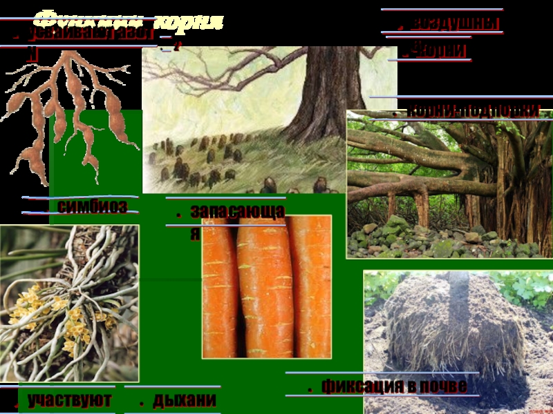 Функции корняусваивают азот N2участвуют в дыханиификсация в почвекорни-подпоркисимбиоззапасающаявоздушные корни