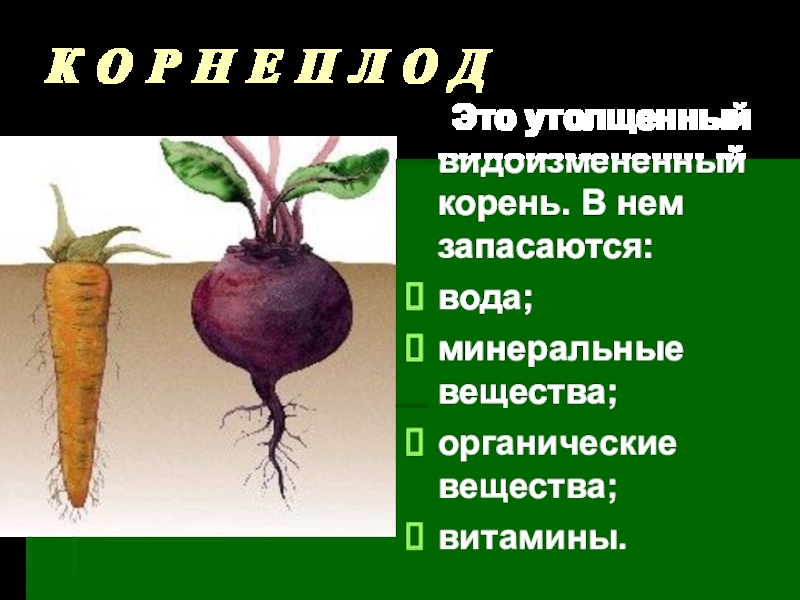 К О Р Н Е П Л О Д  Это утолщенный видоизмененный корень. В нем запасаются: