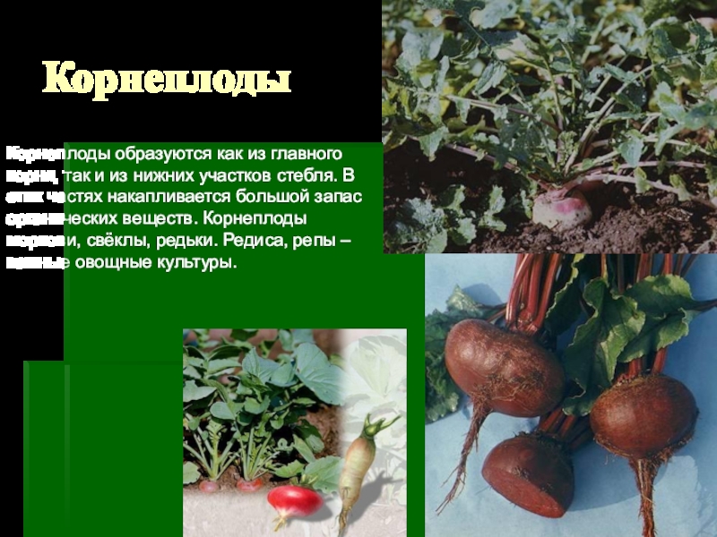 стебля. В этих частях накапливается большой запас органических веществ. Корнеплоды моркови, свёклы, редьки. Редиса, репы – важные овощные культуры.