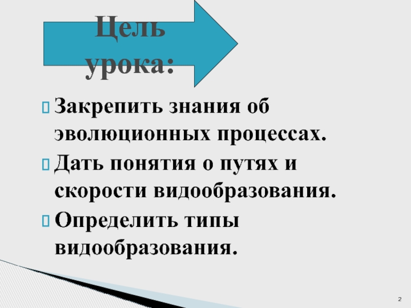 Закрепить знания об эволюционных процессах. Дать понятия о путях и скорости видообразования.Определить типы видообразования.Цель урока:
