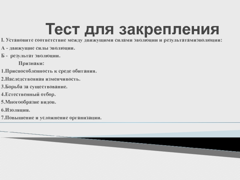 Тест для закрепленияI. Установите соответствие между движущими силами эволюции и результатамиэволюции:А - движущие силы эволюции.Б - результат