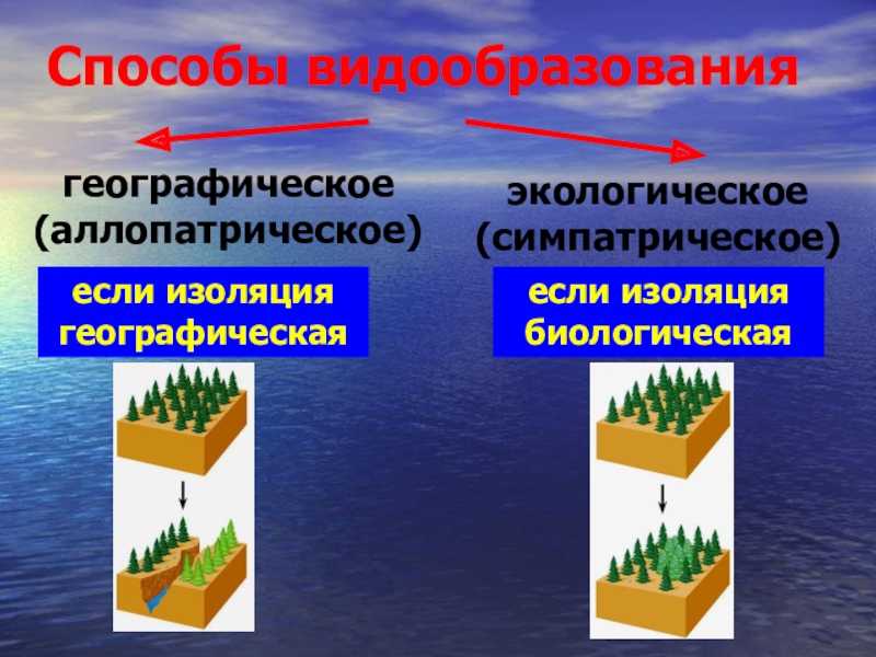 Способы видообразованиягеографическое(аллопатрическое)экологическое(симпатрическое)если изоляция географическаяесли изоляция биологическая