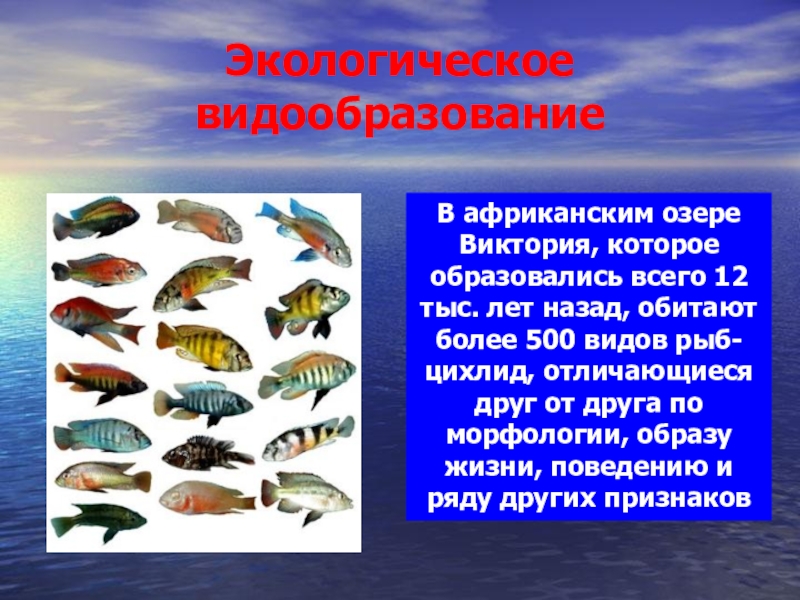 Экологическое видообразованиеВ африканским озере Виктория, которое образовались всего 12 тыс. лет назад, обитают более 500 видов рыб-цихлид,