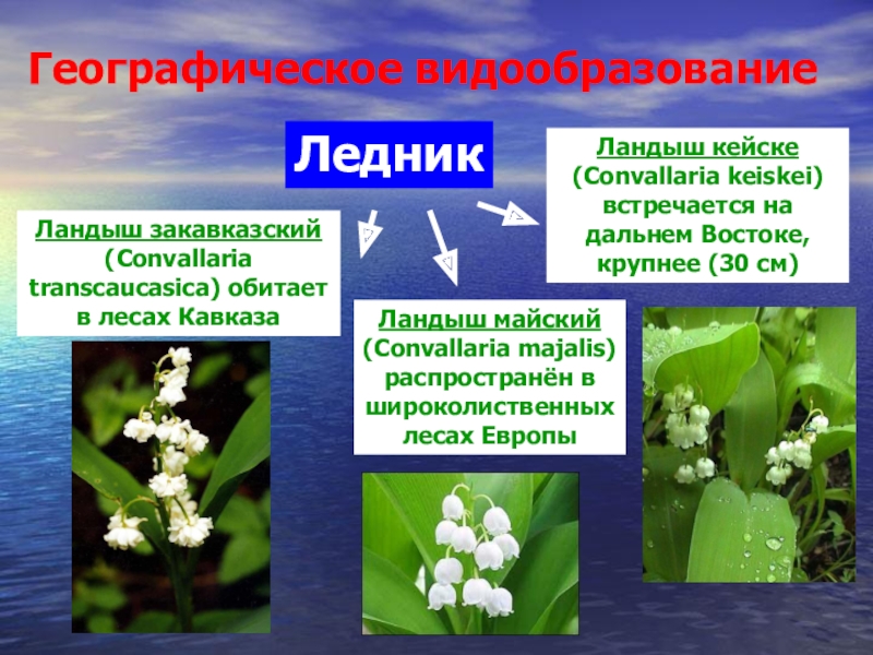 Географическое видообразованиеЛандыш майский (Convallaria majalis) распространён в широколиственных лесах Европы Ландыш кейске (Convallaria keiskei) встречается на дальнем