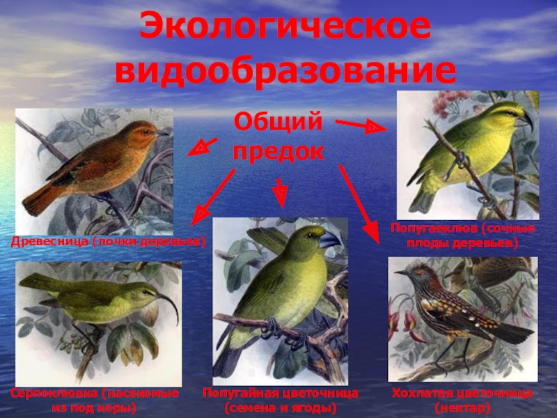 Экологическое видообразованиеПопугайная цветочница (семена и ягоды)Древесница (почки деревьев)Серпоклювка (насекомые из под коры)Попугаеклюв (сочные плоды деревьев)Хохлатая цветочница (нектар)Общий