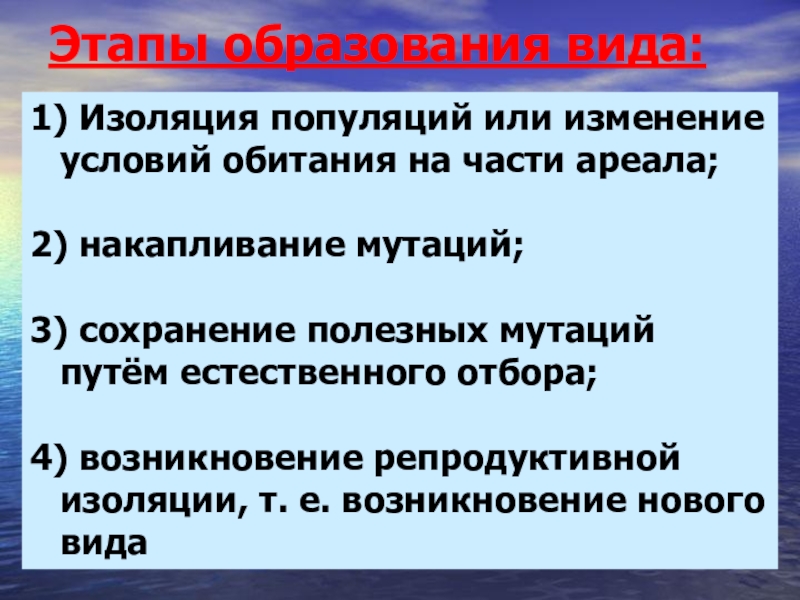 Этапы образования вида:1) Изоляция популяций или изменение условий обитания на части ареала;2) накапливание мутаций;3) сохранение полезных мутаций