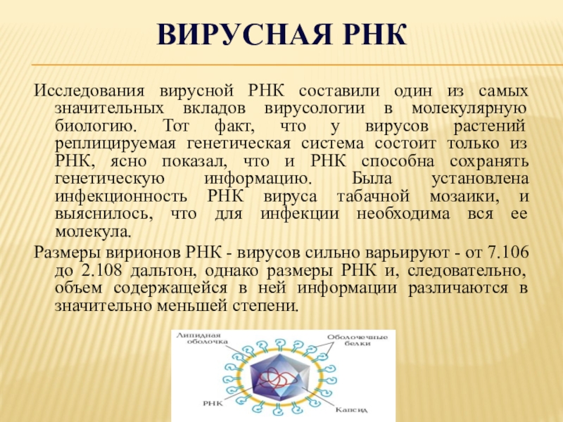 вирусологии в молекулярную биологию. Тот факт, что у вирусов растений реплицируемая генетическая система состоит только из РНК, ясно показал, что и РНК способна сохранять генетическую информацию. Была установлена инфекционность РНК вируса табачной мозаики, и выяснилось, что для инфекции необходима вся ее молекула.