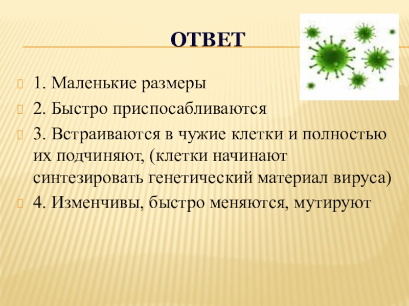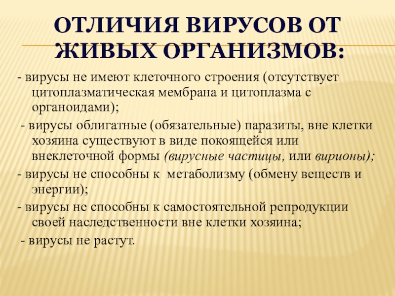 - вирусы не способны к метаболизму (обмену веществ и энергии);