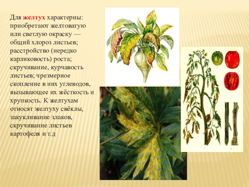 листьев; расстройство (нередко карликовость) роста; скручивание, курчавость листьев; чрезмерное скопление в них углеводов, вызывающее их жёсткость и хрупкость. К желтухам относят желтуху свёклы, закукливание злаков, скручивание листьев картофеля и т.д