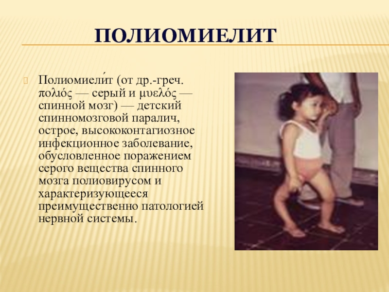— детский спинномозговой паралич, острое, высококонтагиозное инфекционное заболевание, обусловленное поражением серого вещества спинного мозга полиовирусом и характеризующееся преимущественно патологией нервной системы.