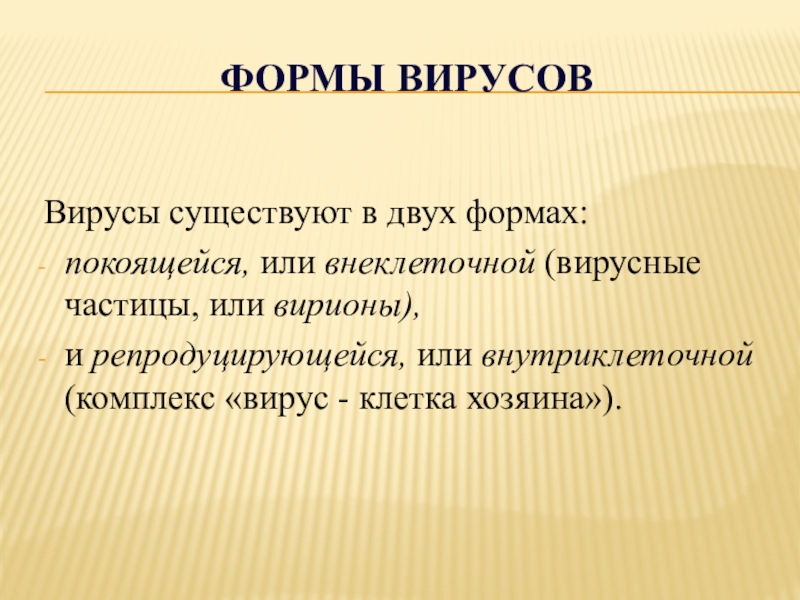 - вирусы облигатные (обязательные) паразиты, вне клетки хозяина существуют в виде покоящейся или внеклеточной формы (вирусные частицы, или вирионы);