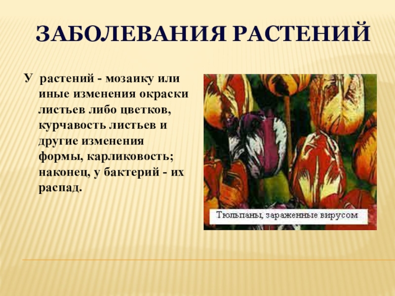 Слайд 14Болезни, вызываемые вирусами, имеют своеобразные симптомы, которые объединяют в две большие