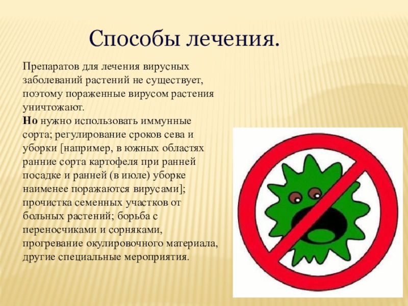 Слайд 16Препаратов для лечения вирусных заболеваний растений не существует, поэтому пораженные вирусом