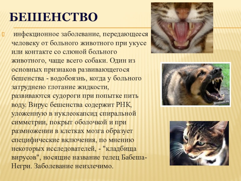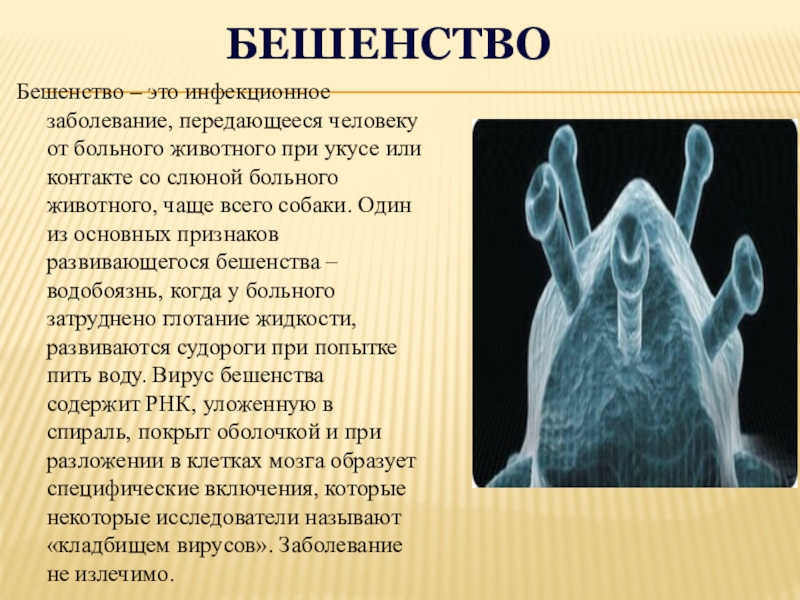 укусе или контакте со слюной больного животного, чаще всего собаки. Один из основных признаков развивающегося бешенства – водобоязнь, когда у больного затруднено глотание жидкости, развиваются судороги при попытке пить воду. Вирус бешенства содержит РНК, уложенную в спираль, покрыт оболочкой и при разложении в клетках мозга образует специфические включения, которые некоторые исследователи называют «кладбищем вирусов». Заболевание не излечимо.