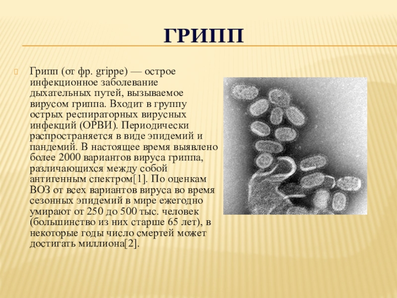 вирусом гриппа. Входит в группу острых респираторных вирусных инфекций (ОРВИ). Периодически распространяется в виде эпидемий и пандемий. В настоящее время выявлено более 2000 вариантов вируса гриппа, различающихся между собой антигенным спектром[1]. По оценкам ВОЗ от всех вариантов вируса во время сезонных эпидемий в мире ежегодно умирают от 250 до 500 тыс. человек (большинство из них старше 65 лет), в некоторые годы число смертей может достигать миллиона[2].