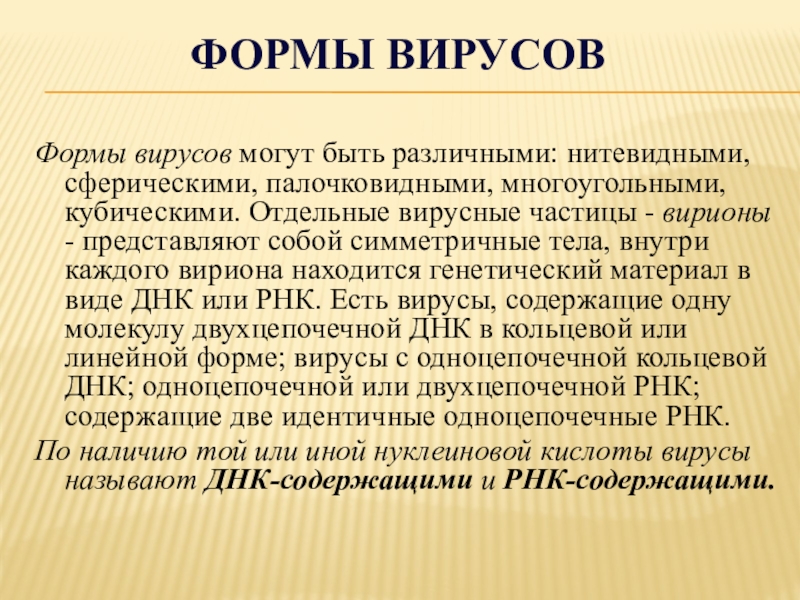 Формы вирусов могут быть различными: нитевидными, сферическими, палочковидными, многоугольными, кубическими.