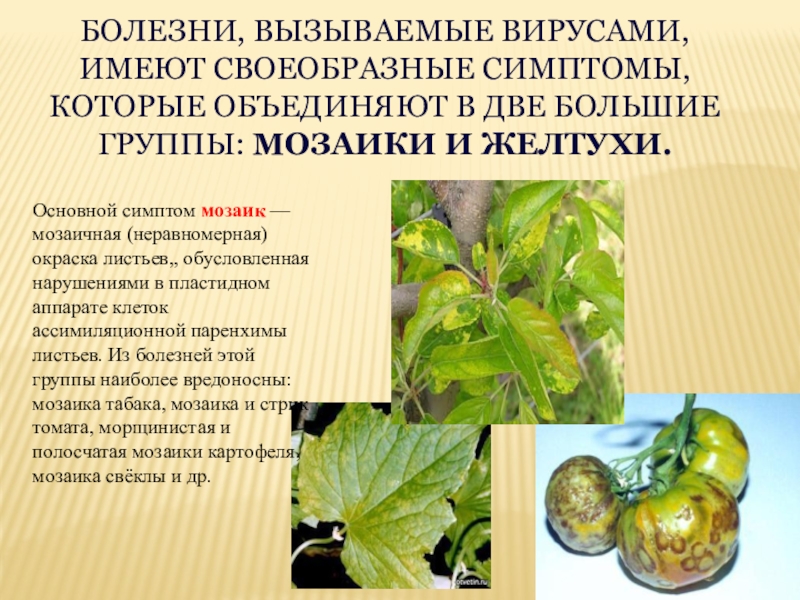 Основной симптом мозаик — мозаичная (неравномерная) окраска листьев,, обусловленная нарушениями в пластидном аппарате клеток ассимиляционной паренхимы листьев. Из болезней этой группы наиболее вредоносны: мозаика табака, мозаика и стрик томата, морщинистая и полосчатая мозаики картофеля, мозаика свёклы и др.