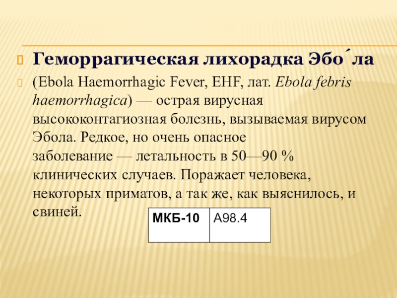 вызываемая вирусом Эбола. Редкое, но очень опасное заболевание — летальность в 50—90 % клинических случаев. Поражает человека, некоторых приматов, а так же, как выяснилось, и свиней.
