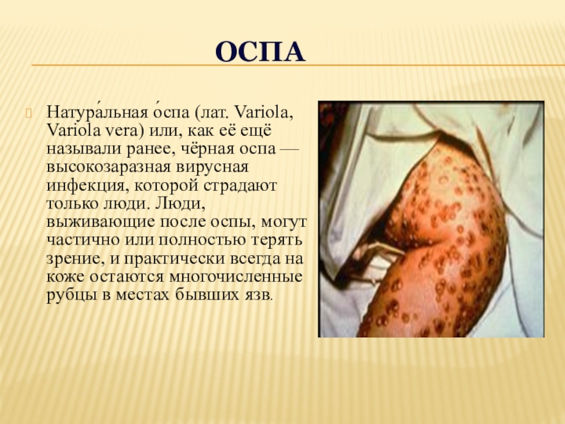 ранее, чёрная оспа — высокозаразная вирусная инфекция, которой страдают только люди. Люди, выживающие после оспы, могут частично или полностью терять зрение, и практически всегда на коже остаются многочисленные рубцы в местах бывших язв.
