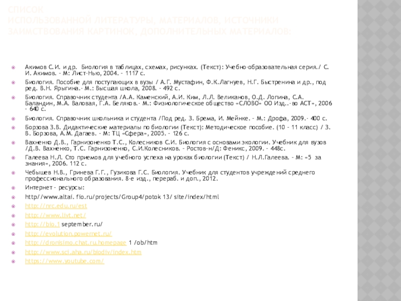 Биология. Справочник студента /А.А. Каменский, А.И. Ким, Л.Л. Великанов, О.Д. Лопина, С.А. Баландин, М.А. Валовая, Г.А. Беляков.- М.: Физиологическое общество «СЛОВО» ОО Изд..-во АСТ», 2006 – 640 с.