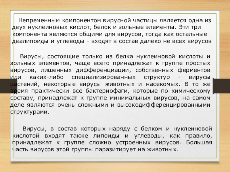 Вирусы, состоящие только из белка нуклеиновой кислоты и зольных элементов, чаще всего принадлежат к группе простых вирусов, лишенных дифференциации, собственных ферментов или каких-либо специализированных структур - вирусы растений, некоторые вирусы животных и насекомых. В то же время практически все бактериофаги, которые по химическому составу, принадлежат к группе минимальных вирусов, на самом деле являются очень сложными и высокодифференцированными структурами.