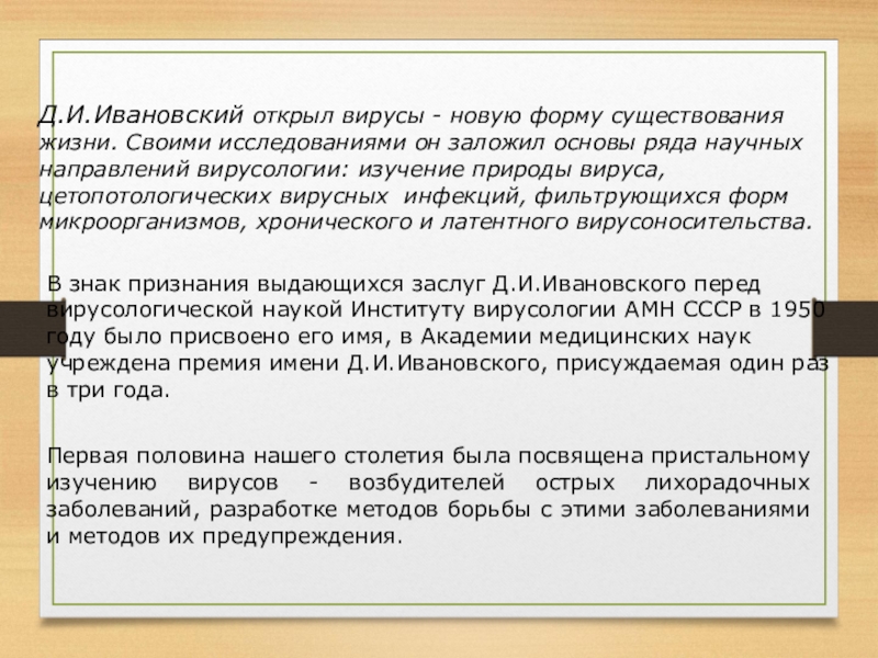 Первая половина нашего столетия была посвящена пристальному изучению вирусов - возбудителей острых лихорадочных заболеваний, разработке методов борьбы с этими заболеваниями и методов их предупреждения.