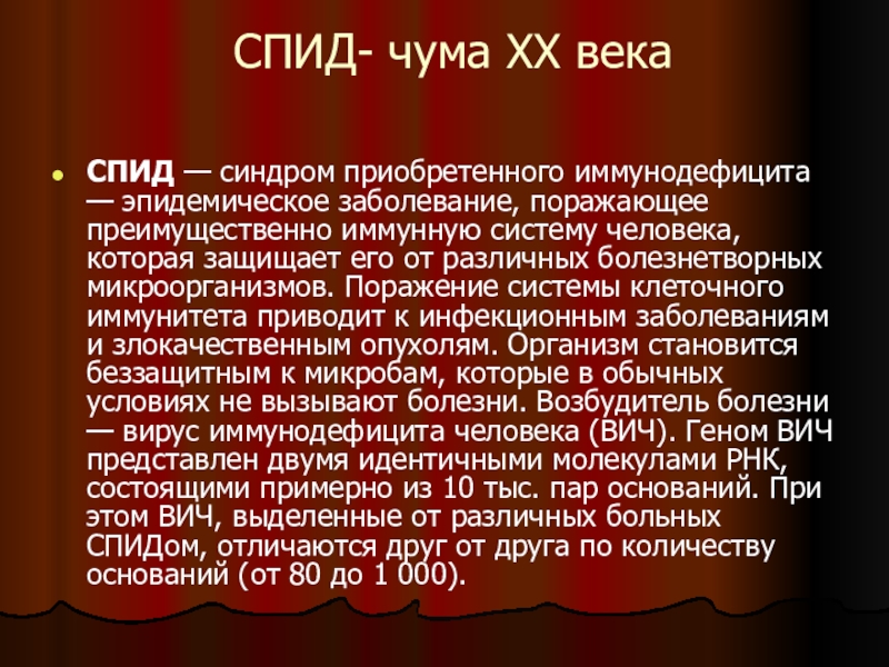 поражающее преимущественно иммунную систему человека, которая защищает его от различных болезнетворных микроорганизмов. Поражение системы клеточного иммунитета приводит к инфекционным заболеваниям и злокачественным опухолям. Организм становится беззащитным к микробам, которые в обычных условиях не вызывают болезни. Возбудитель болезни — вирус иммунодефицита человека (ВИЧ). Геном ВИЧ представлен двумя идентичными молекулами РНК, состоящими примерно из 10 тыс. пар оснований. При этом ВИЧ, выделенные от различных больных СПИДом, отличаются друг от друга по количеству оснований (от 80 до 1 000).