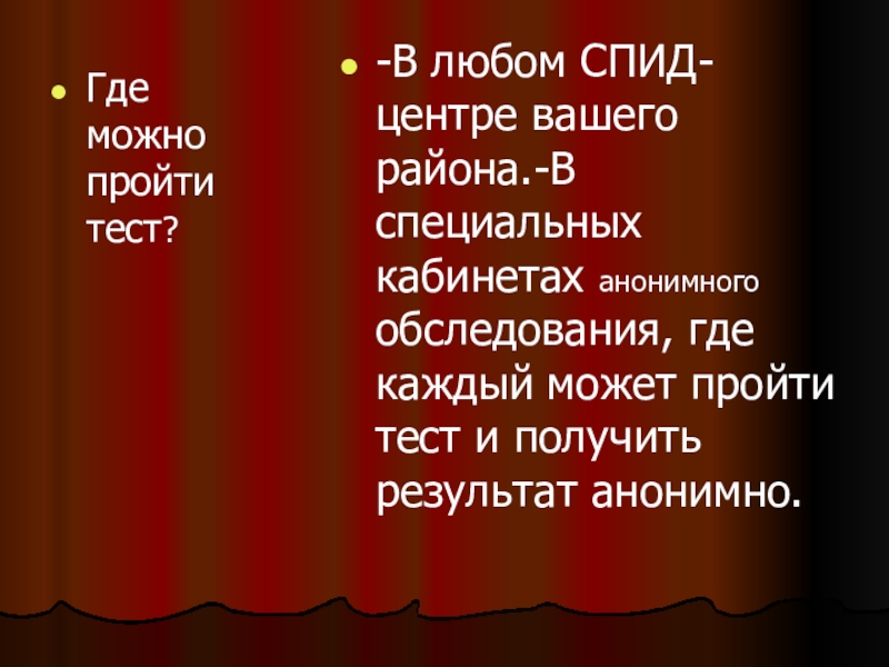 -В любом СПИД-центре вашего района.-В специальных кабинетах