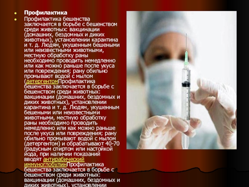 бездомных и диких животных), установлении карантина и т. д. Людям, укушенным бешеными или неизвестными животными, местную обработку раны необходимо проводить немедленно или как можно раньше после укуса или повреждения; рану обильно промывают водой с мылом (детергентомПрофилактика бешенства заключается в борьбе с бешенством среди животных: вакцинации (домашних, бездомных и диких животных), установлении карантина и т. д. Людям, укушенным бешеными или неизвестными животными, местную обработку раны необходимо проводить немедленно или как можно раньше после укуса или повреждения; рану обильно промывают водой с мылом (детергентом) и обрабатывают 40-70 градусным спиртом или настойкой йода, при наличии показаний вводят антирабический иммуноглобулинПрофилактика бешенства заключается в борьбе с бешенством среди животных: вакцинации (домашних, бездомных и диких животных), установлении карантина и т. д. Людям, укушенным бешеными или неизвестными животными, местную обработку раны необходимо проводить немедленно или как можно раньше после укуса или повреждения; рану обильно промывают водой с мылом (детергентом) и обрабатывают 40-70 градусным спиртом или настойкой йода, при наличии показаний вводят антирабический иммуноглобулин вглубь раны и в мягкие ткани вокруг неё, после местной обработки раны немедленно проводят специфическое лечение, которое заключается в лечебно-профилактической иммунизации антирабической вакциной.