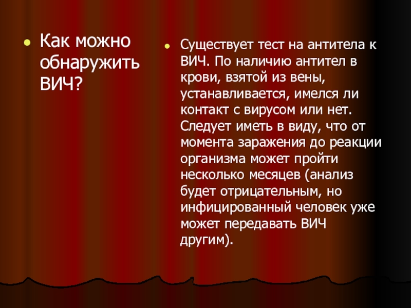 наличию антител в крови, взятой из вены, устанавливается, имелся ли контакт с вирусом или нет.Следует иметь в виду, что от момента заражения до реакции организма может пройти несколько месяцев (анализ будет отрицательным, но инфицированный человек уже может передавать ВИЧ другим).