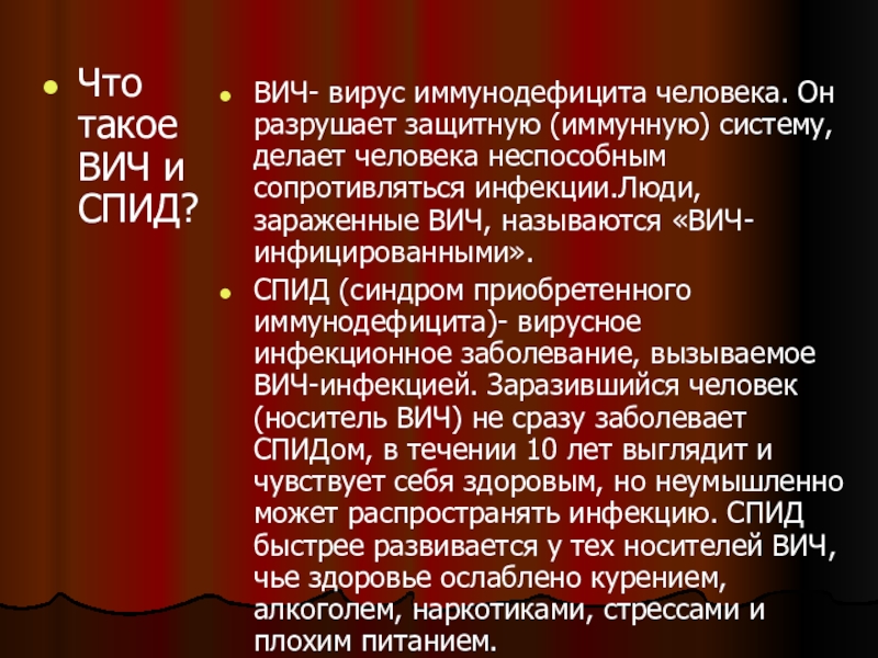 СПИД (синдром приобретенного иммунодефицита)- вирусное инфекционное заболевание, вызываемое ВИЧ-инфекцией. Заразившийся человек (носитель ВИЧ) не сразу заболевает СПИДом, в течении 10 лет выглядит и чувствует себя здоровым, но неумышленно может распространять инфекцию. СПИД быстрее развивается у тех носителей ВИЧ, чье здоровье ослаблено курением, алкоголем, наркотиками, стрессами и плохим питанием.