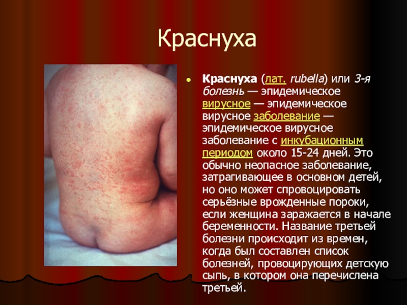 Краснуха (лат. rubella) или 3-я болезнь — эпидемическое вирусное — эпидемическое вирусное заболевание — эпидемическое