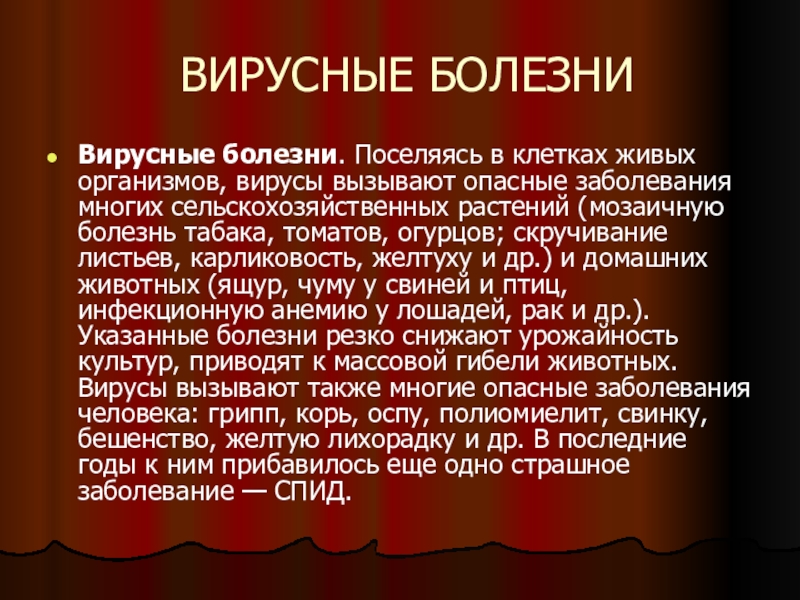заболевания многих сельскохозяйственных растений (мозаичную болезнь табака, томатов, огурцов; скручивание листьев, карликовость, желтуху и др.) и домашних животных (ящур, чуму у свиней и птиц, инфекционную анемию у лошадей, рак и др.). Указанные болезни резко снижают урожайность культур, приводят к массовой гибели животных. Вирусы вызывают также многие опасные заболевания человека: грипп, корь, оспу, полиомиелит, свинку, бешенство, желтую лихорадку и др. В последние годы к ним прибавилось еще одно страшное заболевание — СПИД.